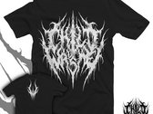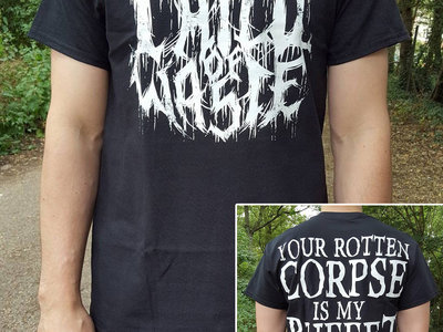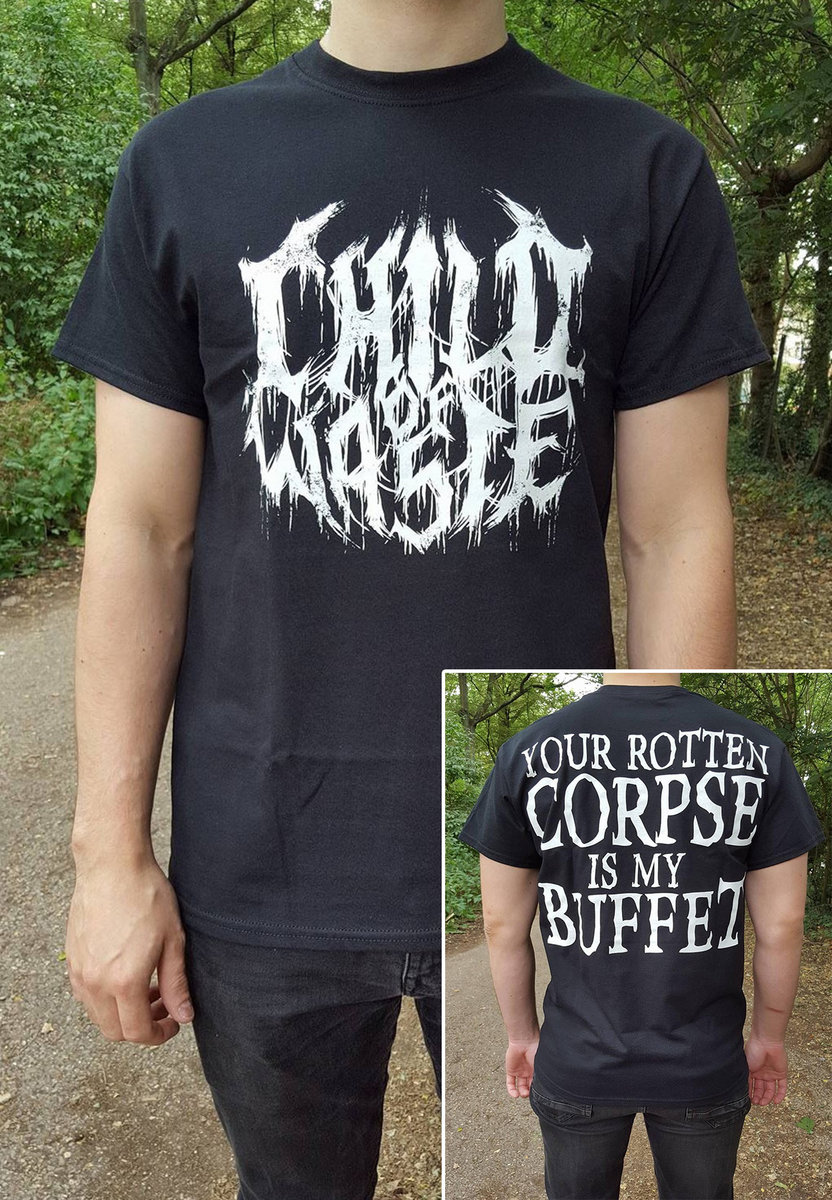 Black t-shirt, white logo on the front, white "Your Rotten Corpse Is My Buffet" lyrics on the back.